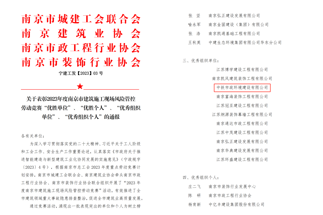 11月13日,2023年度南京市建筑施工現(xiàn)場(chǎng)風(fēng)險(xiǎn)管控勞動(dòng)競(jìng)賽表彰名單公示,南京龍袍項(xiàng)目代表公司獲得“優(yōu)秀組織單位”表彰。...
