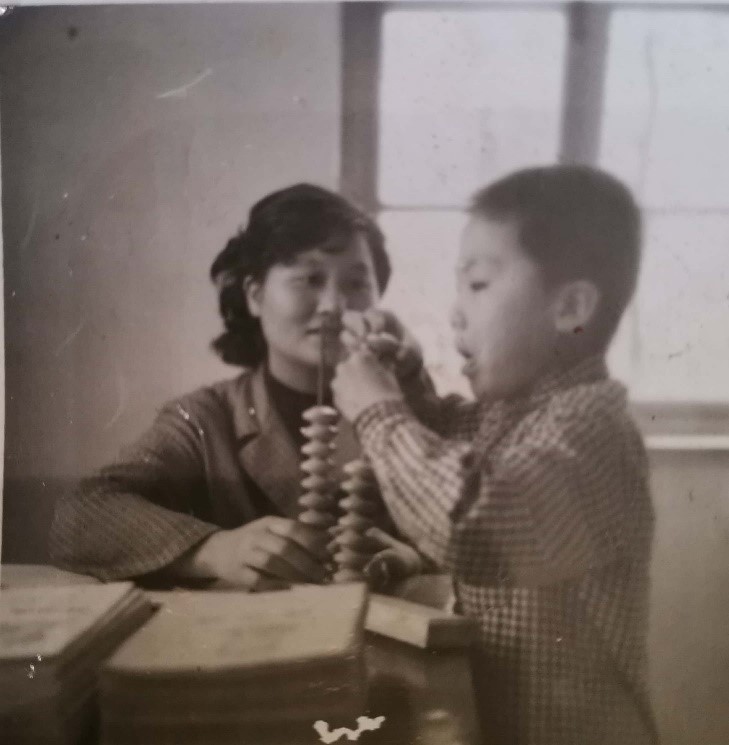 在這張泛黃的老舊照片上,老師孫毅眼神充滿關(guān)懷,手把手地教導著一年級的孔慶偉擺弄教具上的珠子。小朋友神情專注,微微張開的嘴巴似乎急切著想解開教具上謎題。