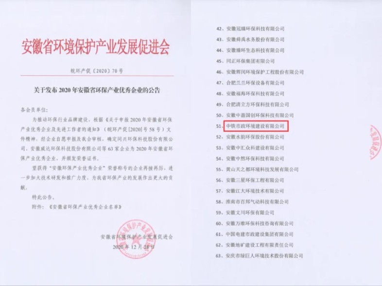 公司榮獲“2020年安徽省環(huán)保產(chǎn)業(yè)優(yōu)秀企業(yè)”,公司承建的樅陽(yáng)縣農(nóng)村自來(lái)水并網(wǎng)PPP項(xiàng)目、馬鞍山市慈湖水廠二期工程項(xiàng)目、合肥潛山路水源管建設(shè)工程項(xiàng)目、潁上縣城市地表水廠及配套管網(wǎng)項(xiàng)目獲得“2020年安徽省AAA級(jí)環(huán)保施工示范工地”,公司總經(jīng)理劉克亮等六名同志獲得“2020年安徽省環(huán)保產(chǎn)業(yè)先進(jìn)工作者”。